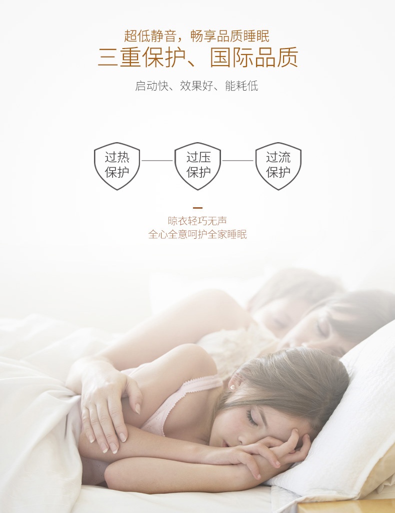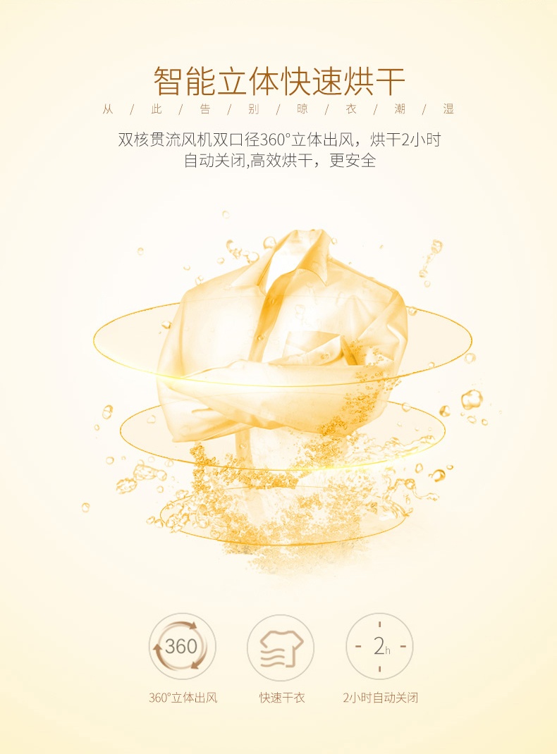 智能風(fēng)干,晾曬更快速,更有360°立體出風(fēng),3D高效烘干,2小時自動關(guān)閉,安全放心,徹底擺脫陰雨天氣晾衣煩惱。