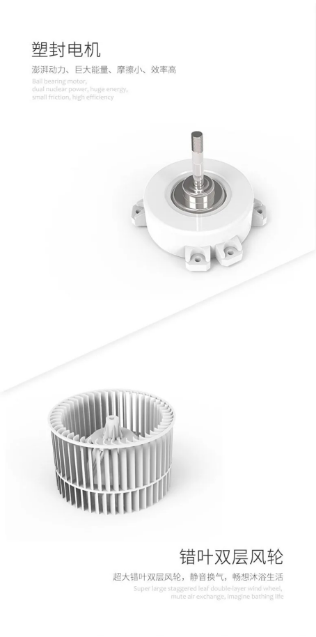 循環(huán)供暖:20cm超大風(fēng)輪,塑封電機,阿基米德螺旋風(fēng)導(dǎo)系統(tǒng),風(fēng)速高達(dá)7.8m/s,360°循環(huán)熱風(fēng),有效將暖氣送到浴室空間各個角落。