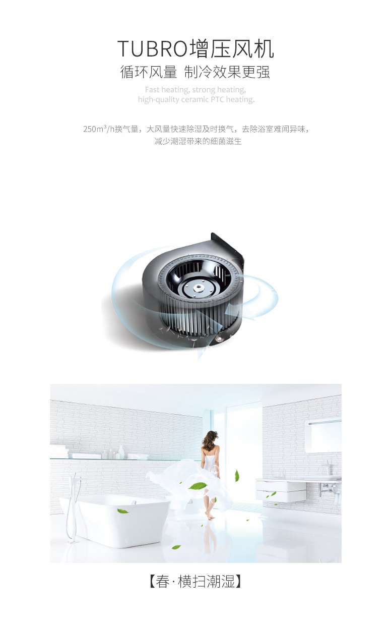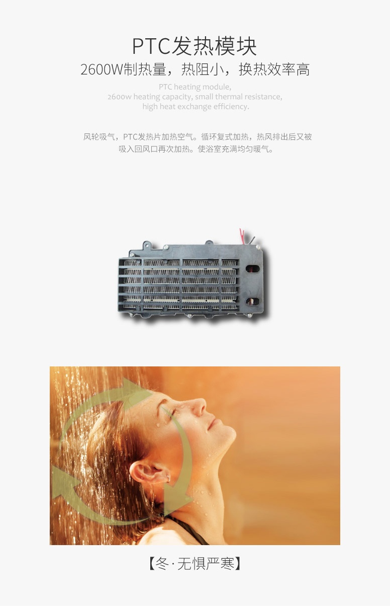冬·無懼嚴(yán)寒:2600W制熱量,風(fēng)輪吸氣,PTC發(fā)熱片加熱空氣。循環(huán)復(fù)式加熱,熱風(fēng)排出后再吸入再次加熱,使浴室充滿均勻暖氣。