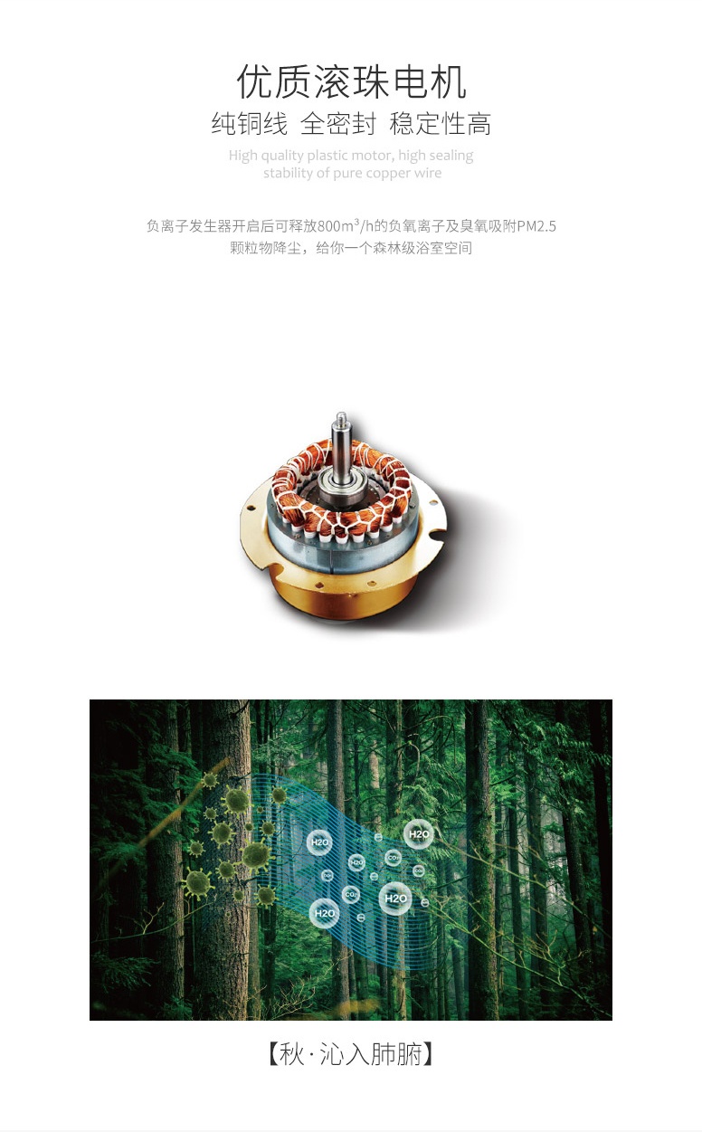 秋·沁入肺腑:負(fù)離子發(fā)生器開啟后可釋放800m3/h的負(fù)離子及臭氧吸附顆粒物降塵,給你一個森林級浴室空間