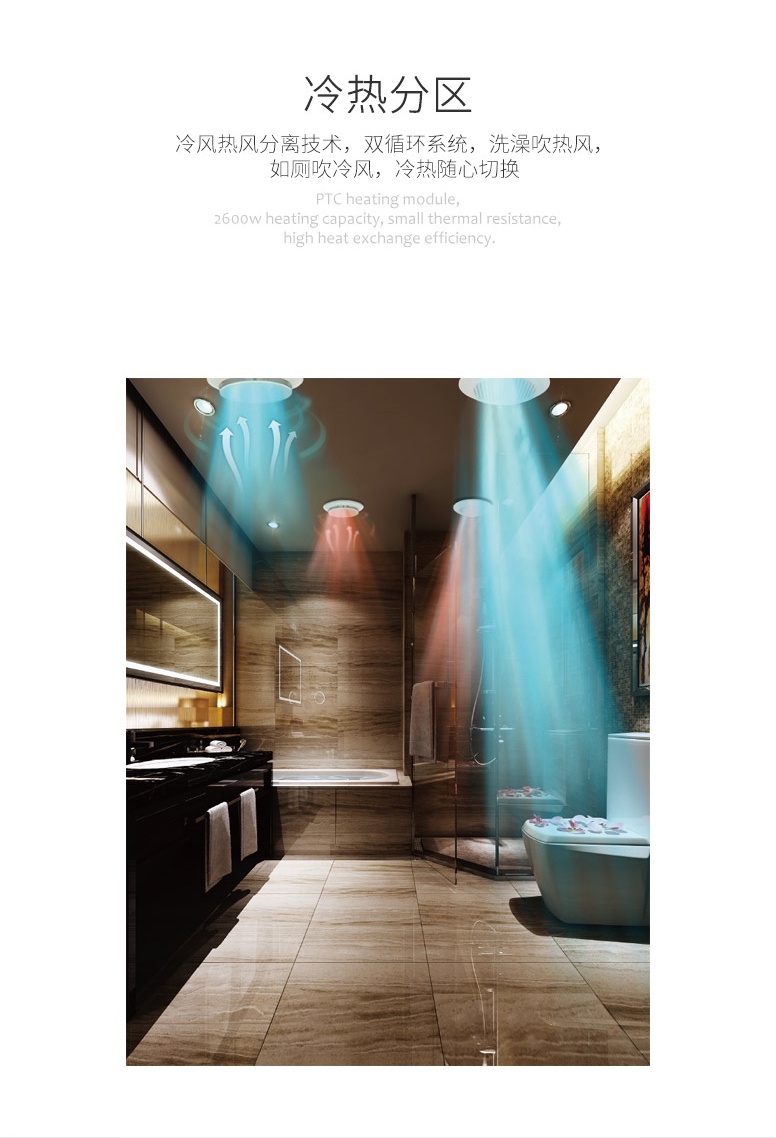 冷熱分區(qū):冷風(fēng)熱風(fēng)分離技術(shù),雙循環(huán)系統(tǒng),洗澡吹冷風(fēng),如廁吹冷風(fēng),冷熱隨心切換。