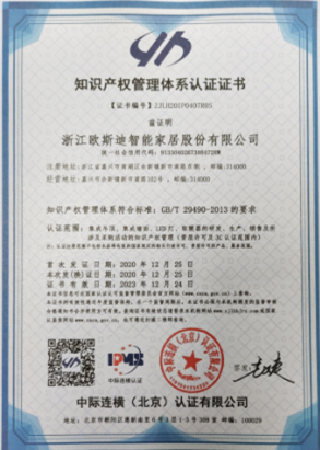 熱烈祝賀浙江歐斯迪智能家居股份有限公司順利通過了知識(shí)產(chǎn)權(quán)管理體系審核,并于2020年底獲得《知識(shí)產(chǎn)權(quán)管理體系認(rèn)證證書》(證書編號(hào):ZJLH20IP0407ROS),這標(biāo)志著歐斯迪在知識(shí)產(chǎn)權(quán)領(lǐng)域得到充分認(rèn)可。